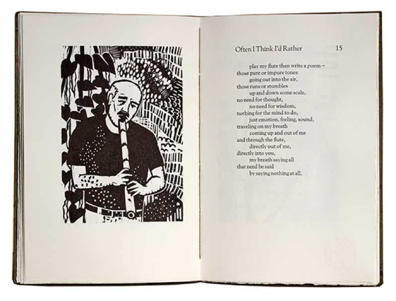 Letterpress printed from hand set Goudy Old Style types, on Hahnemuhle Biblio paper, and hand sewn in an exposed spine, Ethiopian style binding covered in banana paper. Poems reprinted with permission of Copper Canyon Press and the author.