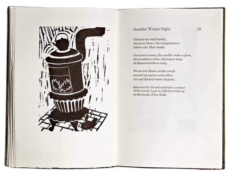 Letterpress printed from hand set Goudy Old Style types, on Hahnemuhle Biblio paper, and hand sewn in an exposed spine, Ethiopian style binding covered in banana paper. Poems reprinted with permission of Copper Canyon Press and the author.