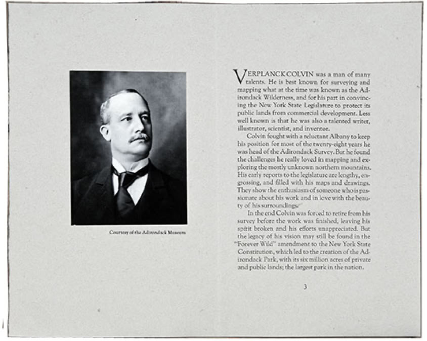 Verplanck Colvin spent 28 years surveying and mapping the Adirondack Mountains of New York State. Through his work and ideas the state formed what has become the largest state park in the country with a unique blend of public and private lands encompassing some six million acres.