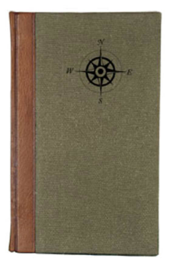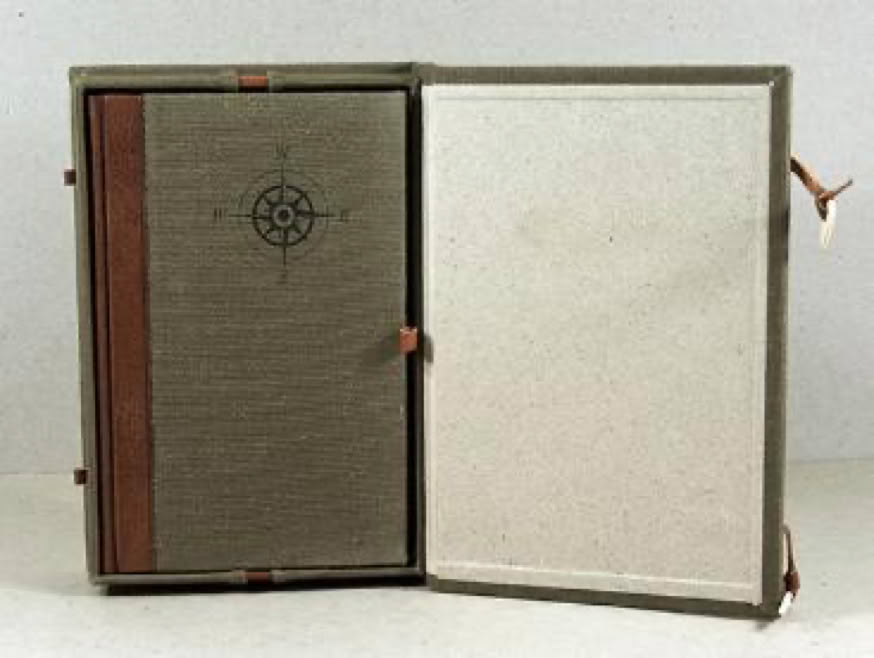 The book in a cloth and leather covered clamshell field case with deer bone clasps. Extra photographs and a paper gadget in a bottom compartment in the case.