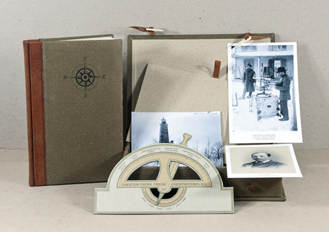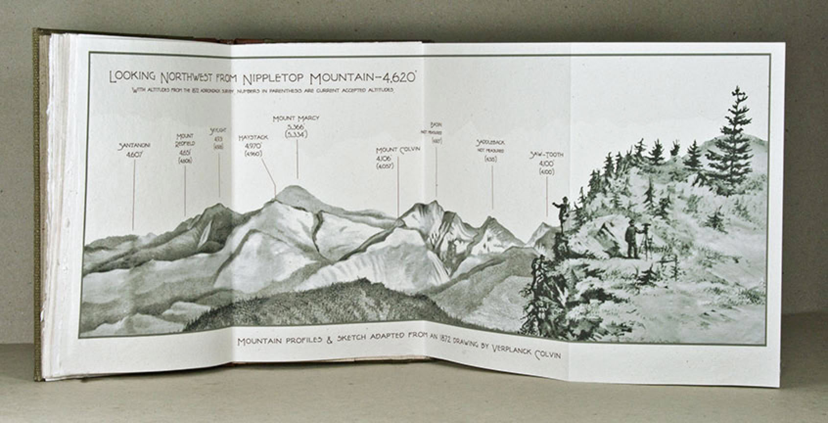 The book alone -5-1/4 x 8-1/2 inches. 42 pages printed letterpress on handmade paper in Goudy Oldstyle type with Americana titles. A drawing by the printer, printed from a polymer plate, opens each of the five chapters. Also included are inkjet printed reproductions of some of Colvin's drawings and photographs printed on handmade paper. (Courtesy of The Adirondack Museum), along wih a four-fold panorama of a portion of the Adirondack High Peaks Region and an 11 x 14 inch map of the Adirondack Park both inkjet printed on handmade paper. All the prints are printed with archival pigment based inks.